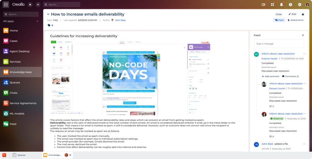 Gestione di casi e richieste di servizio di qualsiasi tipo e complessità, registrazione automatica dei casi, classificazione, instradamento basato sull’intelligenza artificiale e workflow di risoluzione, visualizzazione consolidata dei dati dei clienti e dei casi, comunicazioni omnichannel e strumenti di collaborazione tra team.